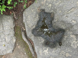 その北海道の中心部の小さい北海度の水たまりに、空と木々と葉っぱが映っている。